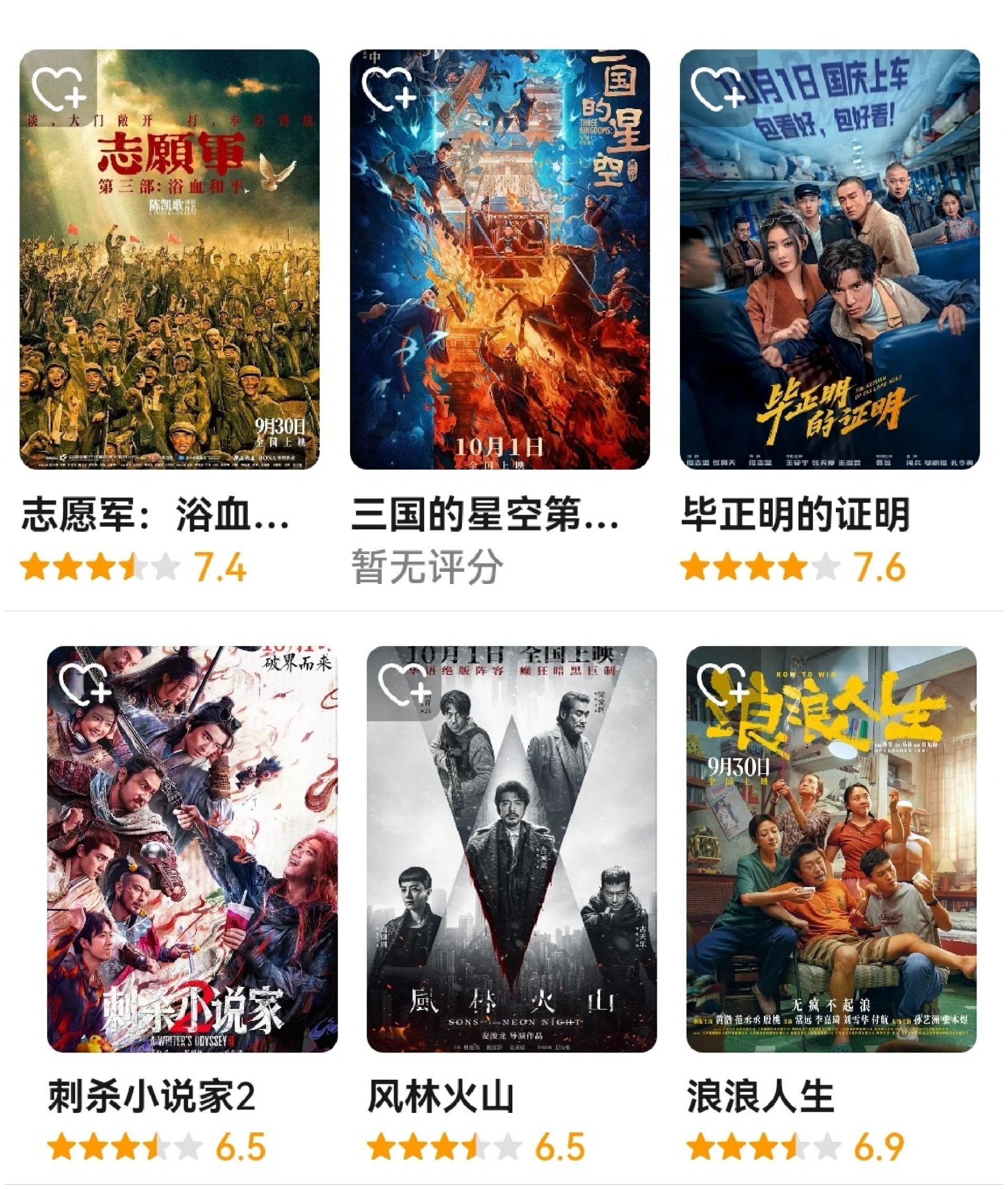 虽然《731》还没有在豆瓣开分,但是国庆档首日过后,已经上映的新片,有5部已经在豆瓣敞亮开分。其中《毕正明的证明》《志愿军:浴血和平》分别拿到7.6分和7.4分,另外三部《浪浪人生》《刺杀小说家2》和《风林火山》分别拿到6.9分、6.5分、6.5分。易中天编剧和监制的历史题材《三国的星空第一部》暂时没有开分,但影片吸引历史爱好者群体,进一步丰富了档期生态。